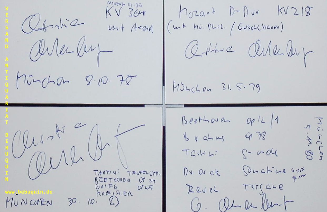 ALTENBURGER, Christian (Violinist): 5 eigenhändig signierte und datierte Autogrammkarten. München (Philharmonie), 1978 – 1985. 8 x 10,5 cm. 5 Karteikarte Christian Altenburger (* 7. September 1957 in Heidelberg) ist ein österreichischer Violinist. Bei einem Einbruch in Altenburgers Wohnung am 29. Mai 2007 wurden ihm unter anderem eine vermeintliche Stradivari-Geige aus dem Jahre 1680 im Wert von zirka 2,5 Mio. Euro sowie eine rund 120.000 Euro teure Vuillaume-Geige gestohlen, die jedoch am 5. Juni 2007 von der Polizei unbeschädigt wiedergefunden wurden.[5] Die drei Täter wurden gefasst und zu sechs bzw. fünf Jahren Haft verurteilt. Sie hatten allein im Mai 2007 zehn Einbrüche verübt. Im Rahmen des Prozesses konnte ein Gutachter die Echtheit der Stradivari nicht bestätigen. Die Geige sei kleiner als eine typische Stradivari, wahrscheinlich sei es eine Geige aus dem Hause Amati. Drei oder vier Meister aus Cremona kämen als Hersteller in Frage. Der Wert sei deshalb mit 500.000 Euro anzusetzen. (Wikipedia)