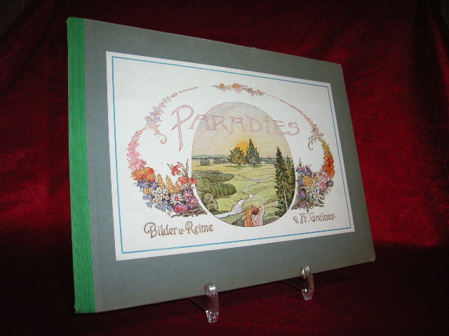 GREINER, Fr.: Paradies. Bilder und Reime. Freiburg im Breisgau (Womber), ca 1925. Quer 4°. 16 Bl. mit 16 (davon 15 farb.) Bildtafeln von Fr. Greiner. OHLn mit mont. Farbbild und den Sternenvorsätzen. Einband etwas berieben, Rücken stockfleckig, Gelenke mit Klebeband verstärkt, kleines Loch im Vorsatz hinterlegt, insgesamt gutes bis sehr gutes Ex. Sehr seltene erste Ausgabe der gereimten Nacherzählung der biblischen Schöpfungsgeschichte (bis zur Vertreibung Adams und Evas aus dem Garten Eden). Die farbenfrohen Illustrationen sind vom Jugendstil beeinflußt (u.a. Fidus), und bei den Reimen hat sich der schwäbische Beamte Friedrich Greiner manchmal ins Unverbindlich-Humorige begeben, wie, wenn er die Auswirkungen der Lichtwerdung umschreibt mit: „Die Englein jubeln: Welch ein Spaß! Der liebe Gott kann wirklich was!“ Auf der letzten Illustration ist eine vielköpfige Kinderschar mit Eltern zu sehen, die wohl die Familie von Adam und Eva darstellen soll. Und Eva erzählt den 13 Kleinen von Christkind und Lichterbaum…– Kosch VI,759.