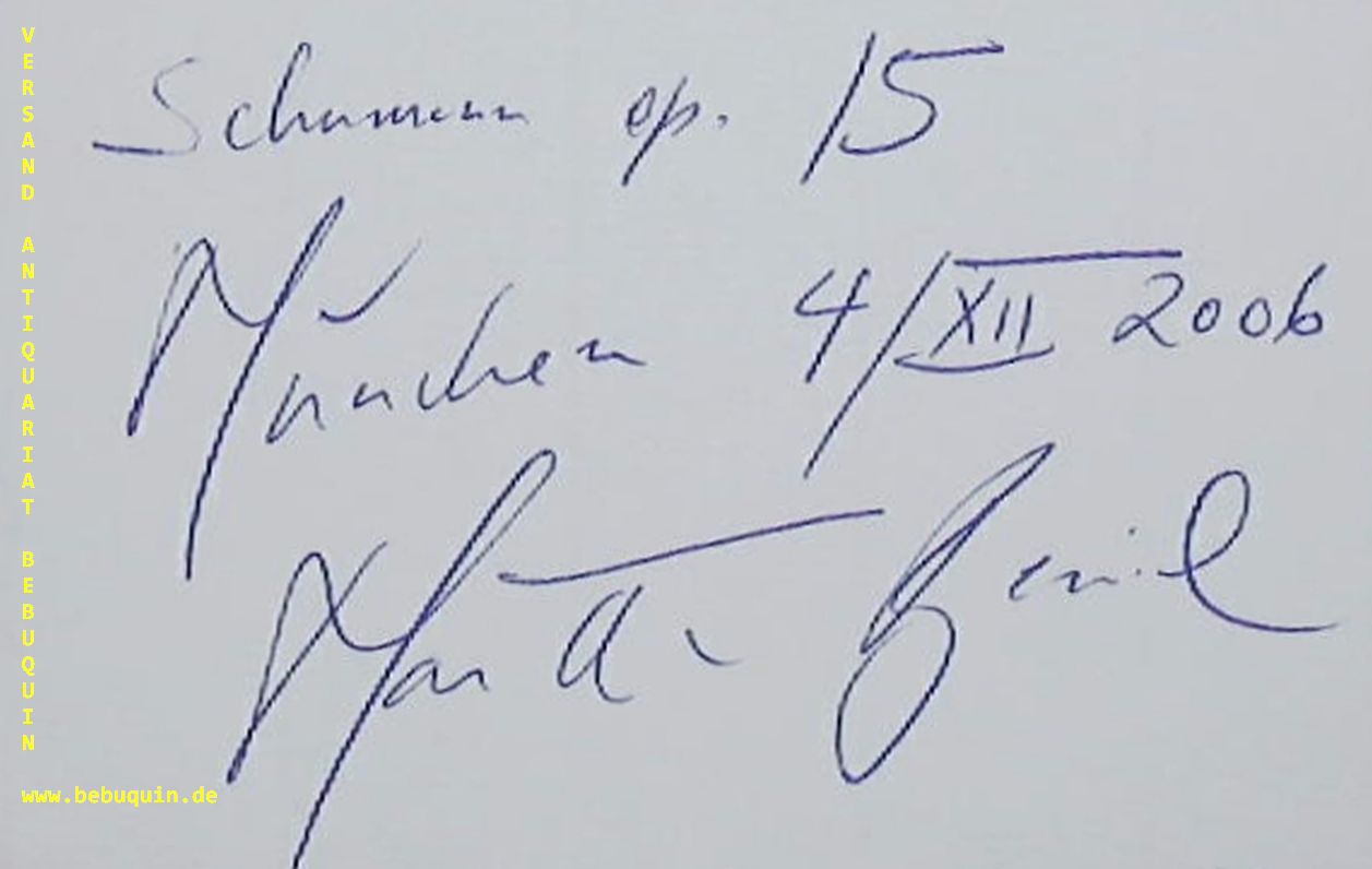ARGERICH, Martha (Pianistin): eigenhändig signierte und datierte Autogrammkarte. Schumann op. 15. München (Herkulessaal), 4.12.2006. 8 x 12,5 cm. Karteikarte. Martha Argerich (* 5. Juni 1941 in Buenos Aires) ist eine argentinisch-schweizerische Pianistin. Im Jahr 2005 erhielt sie die Auszeichnung Praemium Imperiale, den „Nobelpreis der Künste“. Im Jahr 2014 wurde sie mit dem ECHO Klassik in der Kategorie „Konzerteinspielung des Jahres (Klavier)“ mit dem Orchestra Mozart Bologna unter Claudio Abbado für Mozarts Klavierkonzerte 20 & 25 ausgezeichnet. 2016 erhielt sie den Kennedy-Preis. (Wikipedia)
