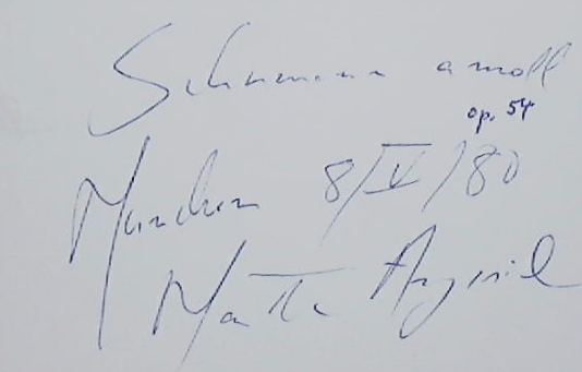 ARGERICH, Martha (Pianistin): eigenhändig signierte und datierte Autogrammkarte. Schumann a moll. München (Herkulessaal), 8.5.1980. 8 x 12,5 cm. Karteikarte. Martha Argerich (* 5. Juni 1941 in Buenos Aires) ist eine argentinisch-schweizerische Pianistin. Im Jahr 2005 erhielt sie die Auszeichnung Praemium Imperiale, den „Nobelpreis der Künste“. Im Jahr 2014 wurde sie mit dem ECHO Klassik in der Kategorie „Konzerteinspielung des Jahres (Klavier)“ mit dem Orchestra Mozart Bologna unter Claudio Abbado für Mozarts Klavierkonzerte 20 & 25 ausgezeichnet. 2016 erhielt sie den Kennedy-Preis. (Wikipedia)