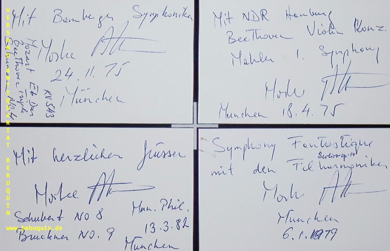 ATZMON, Moshe (Dirigent): 6 eigenhändig signierte und datierte Autogrammklarten mit teils umfangreicher eigenhändiger Stück- und Orchesterbeschreibung. Leipzig, 1971 – 1983. 8 x 12,5 cm. 6 Karteikarten. teils leichte Rostspur. Moshe Atzmon (* 30. Juli 1931 in Budapest; ursprünglich Móse Grószberger) ist ein israelischer Dirigent. (Wikipedia)