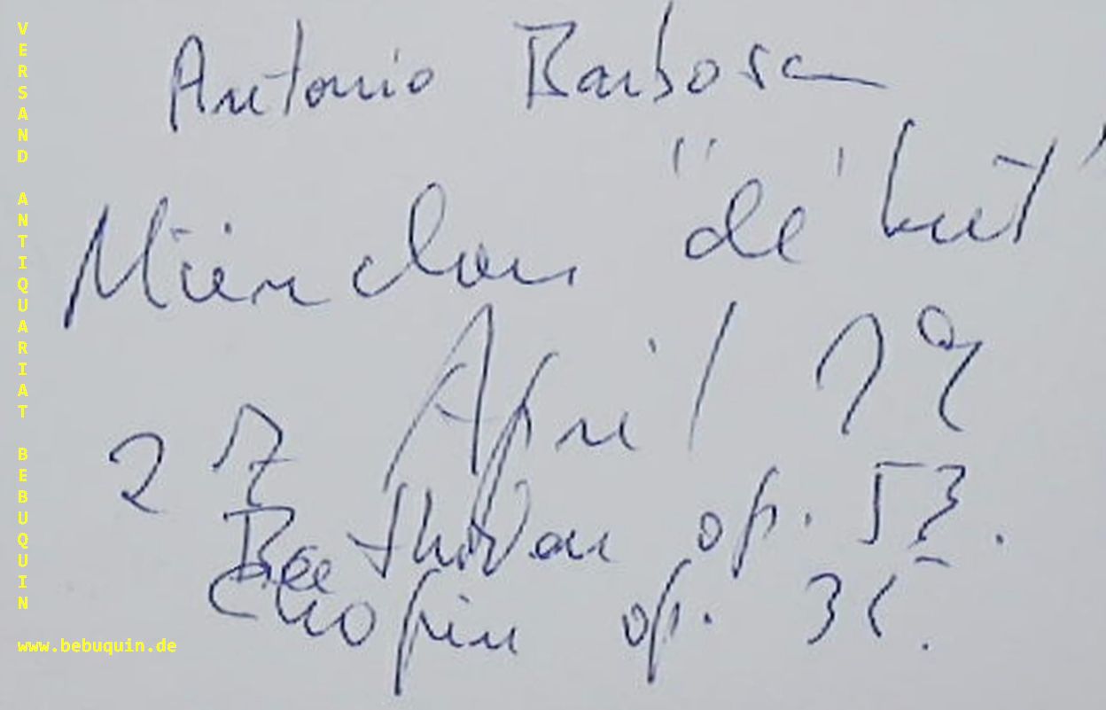 BARBOSA, Antonio Guedes (Pianist): eigenhändig signierte und datierte Autogrammkarte: Beethoven op. 53 Chopin op. 32. München (Kongresssaal), 27.4.1979. 8 x 12,5 cm. Karteikarte. Antônio Guedes Barbosa (Piano) (Born: December 9, 1943 – João Pessoa / Died: September 2, 1993 – São Paulo.) The Brazilian pianist and music pedagogue, Antônio Guedes Barbosa, studied piano with Claudio Arrau. Barbosa was singled out by Vladimir Horowitz and Claudio Arrau as one of the five best pianists of his generation – alongside Martha Argerich, Daniel Barenboim, Krystian Zimerman and Garrick Ohlsson. He was one of the most prolific Brazilian musicians in terms of recordings of the highest quality. His legacy on disc includes important collection of pieces by Frédéric Chopin, a panel of American critics, gathered in 1992 by the American Record Guide, even compared them to the greatest recordings, „Rubinstein to Alfred Cortot, Guiomar Novães, Martha Argerich.“ Thomas Frost went further. In a letter to Allan Kozin, the critic of the New York Times, producer of Vladimir Horowitz, who also produced Antônio Guedes Barbosa’s second version of of the 51 Mazurkas, called them „considerably more poetic than those of Rubinstein.“ And Stereo Review, New York, which gave the title of „Best of the Year“ for the 14 Waltzes, printed: „… Barbosa is possibly the best interpreter of Chopin of his generation.“ The CD, with the latter recordings and the Lieder of Schubert, was launched in the USA two days after his heart stopped, in Sao Paulo, on September 2, 1993. (Bach Cantatas).