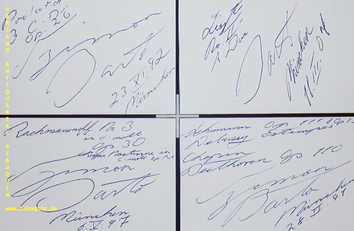 BARTO, Tzimon (Pianist): 5 eigenhändig signierte und datierte Autogrammkarten. München (Philharmonie), 1987 – 2004. 8 x 12,5 cm. 5 Karteikarten. Tzimon Barto (* 2. Januar 1963 in Eustis (Florida); Geburtsname Johnny Barto Smith) ist ein US-amerikanischer Konzertpianist, Dirigent und Autor. In neuerer Zeit ist er unter dem Namen Barto Smith auch als Schriftsteller und Verfasser von Gedichtzyklen tätig geworden. Dabei steht sein Projekt mit dem Namen The Stelae im Vordergrund. Dieses Werk soll nach seiner Fertigstellung aus 3367 Gedichten und Prosa-Segmenten bestehen, entsprechend der Anzahl der Vorkommnisse des Namens Gottes zusammen mit dem zugehörigen Verb in der dritten Person in der Bibel. (Wikipedia)