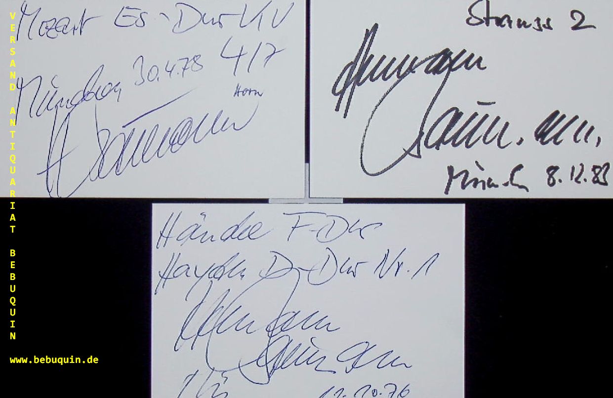 BAUMANN, Hermann (Hornist): 3 eigenhändig signierte und datierte Autogrammkarte. München (Philharmonie), 1976 – 1983. 8 x 12,5 cm. 3 Karteikarte. Hermann Rudolph Konrad Baumann (* 1. August 1934 in Hamburg) ist ein deutscher Hornist. Er erhielt in seiner Jugend Klavier- und Cellounterricht, und wurde zum Chorleiter ausgebildet. Zunächst war er Sänger sowie Jazzdrummer, wo er unter anderem Mitglied in der Bigband von Ernst Mosch war. Da ihm der Transport des Schlagzeugs, bedingt durch die Nachkriegszeit auch mit dem Handkarren, lästig war, begann er sich erst im Alter von 17 Jahren mit dem Horn zu beschäftigen. (Wikipedia)