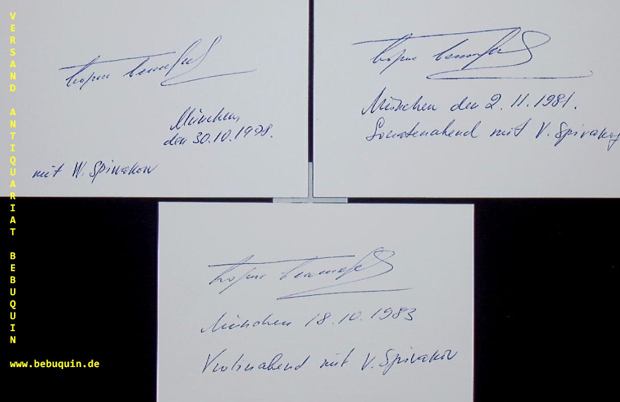 BECHTEREW, Boris (Pianist): 3 eigenhändig signierte und datierte Autogrammkarten. München (Philharmonie), 1978 – 1983. 8 x 12,5 cm. 3 Karteikarten. Boris Bekhterev is a Russian-born pianist. He taught at the Moscow Conservatory for fourteen years. He has held concerts at Carnegie Hall, La Scala Theatre, Vienna Konzerthaus, Queen Elizabeth Hall, Tokyo Bunkakaikan, among others. After being professor of piano at Kobe College and Mukogawa University in Japan for 15 years, he lives now in Italy where he continues his pedagogic and artistic life. In 2015 he completed recording of all Skriabin compositions for piano solo. (Selbstportrait)