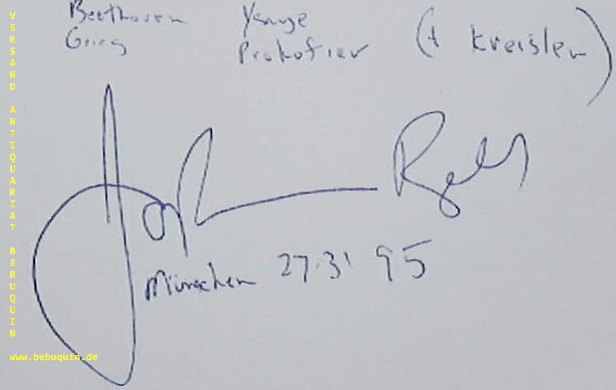 BELL, Joshua (Violinist): eigenhändig signierte und datierte Autogrammkarte: Beethoven, Grieg, Prokofiev (+ Kreisler). München (Philharmonie), 27.3.1995. 8 x 12,5 cm. Karteikarte. Joshua David Bell (* 9. Dezember 1967 in Bloomington, Indiana) ist ein US-amerikanischer Violinist. Im Alter von 14 Jahren trat Bell als Solist mit dem Philadelphia Orchestra unter der Leitung von Riccardo Muti auf. Er studierte Violine an der Indiana University Jacobs School of Music und absolvierte 1984 die Bloomington High School North. 1989 erhielt Bell ein Künstlerdiplom als Violinist von der Indiana University. Seit seinem Carnegie-Hall-Debüt 1985 ist er weltweit mit nahezu allen bedeutenden Orchestern und Dirigenten unserer Zeit aufgetreten. Neben dem klassischen Standardrepertoire hat er zahlreiche moderne und zeitgenössische Werke aufgeführt, mehrere darunter eigens für ihn komponiert. Besondere Bekanntheit erlangte Joshua Bell durch die Einspielung der Originalmusik von John Corigliano für den Oscar-prämierten Soundtrack des Filmes Die rote Violine im Jahr 1998 und der Musik für den Film Der Duft von Lavendel 2004. Bells Violine ist die 1713 von Antonio Stradivari gebaute sogenannte Gibson ex Huberman, bekannt für ihren Diebstahl aus der Carnegie-Hall-Künstlergarderobe des damaligen Besitzers und Geigers Bronislaw Huberman im Jahr 1936. Der Dieb, ein Wander- und Auftragsmusiker, blieb bis zu seinem Tode im Besitz der Stradivari und gestand erst 1985 seiner Frau auf dem Sterbebett den Diebstahl. 2001 konnte schließlich Joshua Bell die Violine erwerben. Am 26. Mai 2011 wurde Bell zum Musikdirektor der Academy of St. Martin in the Fields in London ernannt. (Wikipedia)
