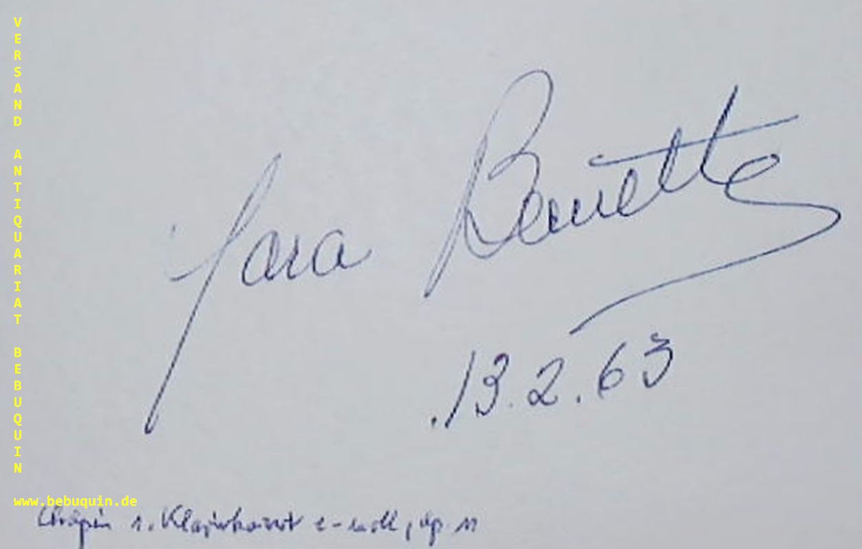 BERNETTE, Yara (Pianistin): eigenhändig signierte und datierte Autogrammkarte (einzeln und zusammen). München, 13.2.1963. 8 x 12,5 cm. Karteikarte. Bernette Epstein, known as Yara Bernette (March 14, 1920 – March 30, 2002), was a Brazilian classical pianist. Considered one of Brazil’s foremost pianists of the twentieth century, she achieved international renown for her performance of Classical and Romantic works, notably those of Rachmaninoff, Mozart, Chopin, Debussy, and Brazilian composer Heitor Villa-Lobos, in concerts in Brazil, Europe, and the United States. She chaired the piano department at the Hochschule für Musik und Theater Hamburg, Germany, from 1972 to 1992. (Wikipedia)