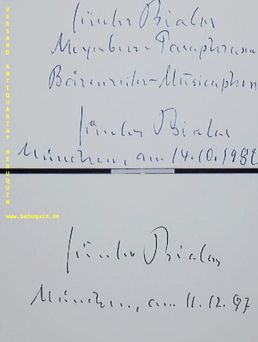 BIALAS, Günter (Komponist): 2 eigenhändig signierte Autogrammkarten. . München (Philharmonie), 1982 + 1987. 8 x 12,5 cm. 2 Kartenkarten. Günter Bialas (* 19. Juli 1907 in Bielschowitz, Oberschlesien; † 8. Juli 1995 in Glonn, Oberbayern) war ein deutscher Komponist und Hochschullehrer. (Wikipedia)