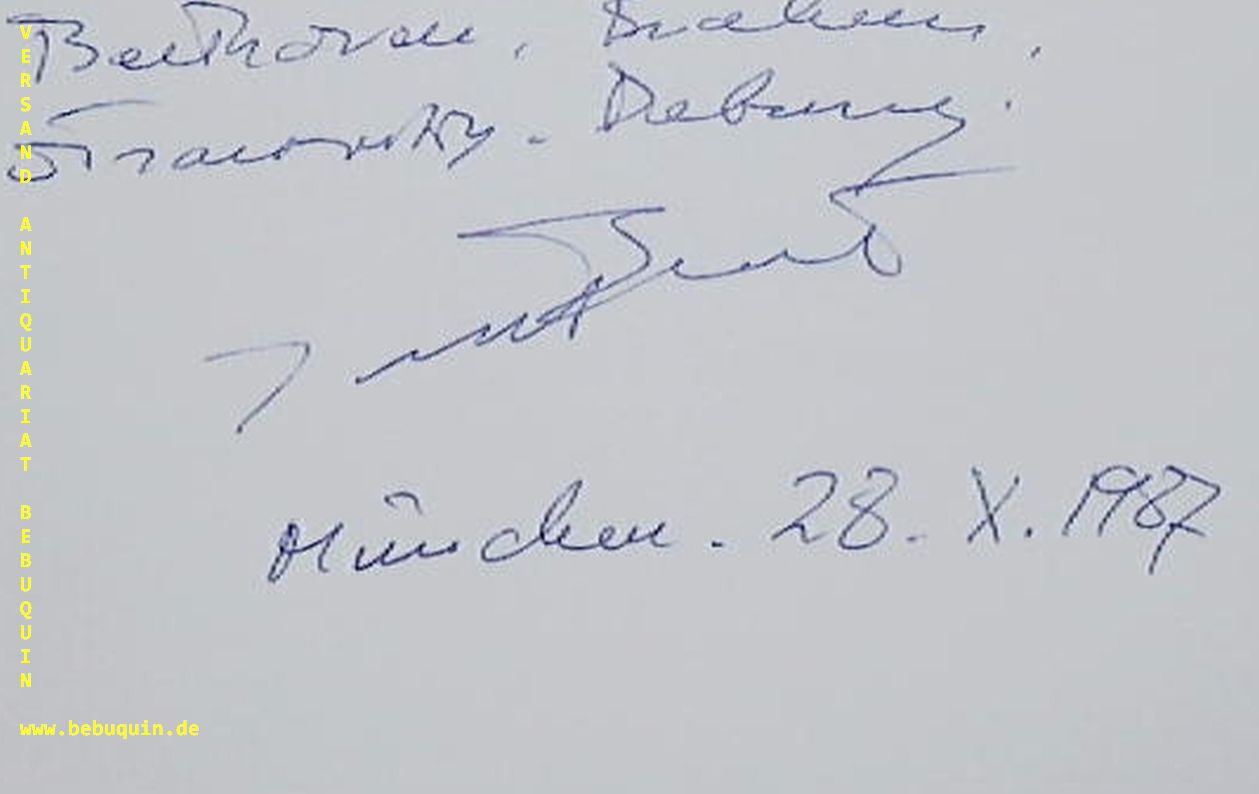 BIRET, Idil (Pianistin): eigenhändig signierte Autogrammkarte. München (Philharmonie), 28.10.1987, 8 x 12,5 cm. Kartenkarte. Idil Biret (* 21. November 1941 in Ankara) ist eine türkische Pianistin. Ihr erster Musiklehrer war Mithat Fenmen. Im Jahr 1948 erließ Ismet Inönü eigens für Biret das sogenannte Wunderkindgesetz (türkisch: Harika Çocuk Yasasi), das ihr die passende Förderung im Ausland ermöglichte. Biret erhielt ihre weitere musikalische Ausbildung am Conservatoire de Paris und war dort Schülerin von Nadia Boulanger. Sie schloss mit 15 Jahren ihr Studium mit drei Preisen ab und vervollständigte ihre Ausbildung bei Alfred Cortot und hatte Wilhelm Kempff bis zu seinem Tode als Berater. (Wikipedia)
