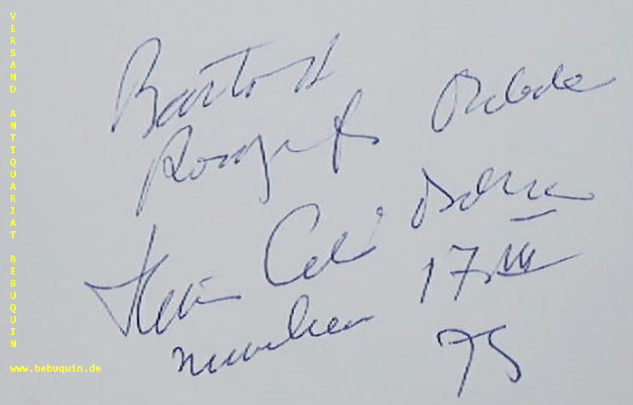 CELIBIDACHE, Sergiu (Dirigent): eigenhändig signierte und datierte Autogrammkarte: Bartsch Konzertführer . . . . München (Herkulessaal), 17.2. oder 3.1979. 8 x 12,5 cm. Karteikarte. Sergiu Celibidache (* 28. Junijul./ 11. Juli 1912greg. in Roman, Region Moldau, Rumänien; † 14. August 1996 in La Neuville-sur-Essonne bei Paris) war ein rumänischer Dirigent und Musiklehrer, der später die deutsche Staatsbürgerschaft annahm. Anders als Herbert von Karajan lehnte er die Musikvermarktung per Schallplatte oder CD ab und fühlte sich als Antipode zu Karajan. Seine Erklärung für diese Einstellung war philosophisch: Musik sei keine Konserve, die man festhalten könne, sie lebe im Augenblick der Entstehung. Musik sei auch an den speziellen Raum ihrer Aufführung (etwa an einen speziellen Konzertsaal) gebunden, der Reichtum der Musik, der sich nur im Raum entfalten könne, werde durch jegliche Aufnahme und Lautsprecher-Wiedergabe beschnitten. Er lehnte daher Aufnahmen ab, so dass die ersten CDs (Konzertmitschnitte) erst nach seinem Tod veröffentlicht wurden. (Wikipedia)