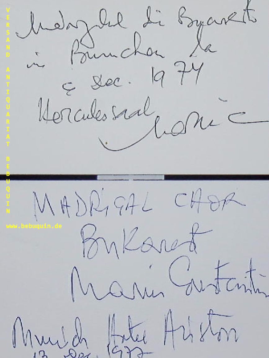 CONSTANTIN, Marin (Dirigent): 2 eigenhändig signierte und datierte Autogrammkarten. München (Herkulessaal), 1974 – 1977. 8 x 12,5 cm. 2 Karteikarten. Marin Constantin (* 27. Februar 1925 in Urleta, Kreis Prahova; † 1. Januar 2011) war ein rumänischer Komponist und Dirigent. (Wikipedia).
