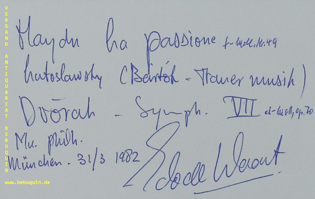 DEWAART, Edo (Dirigent): eigenhändig signierte Autogrammkarte mit ausführlicher eigenhänidger Stückbeschreibung. München (Herkulessaal), 31.3.1982. 8 x 12,5 cm. Karteikarte. Edo de Waart AO (* 1. Juni 1941 in Amsterdam) ist ein niederländischer Dirigent. (Wikipedia)