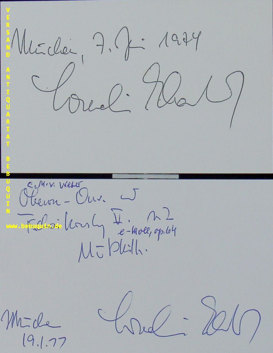 EBERHARDT, Cornelius (Dirigent): 2 eigenhändig signierte und datierte Autogrammkarten. München (Philharmonie), 7.6.1974 + 19.1.1977. 8 x 12,5 cm. 2 Karteikarten. Cornelius Eberhardt (* 3. Januar 1932 in Oberaudorf; † 12. April 2011) war Professor, Generalmusikdirektor (GMD) sowie ehemaliger Präsident der Hochschule für Musik und Theater München[1] und Dirigent mehrerer nationaler und internationaler Orchester. Wikipedia.