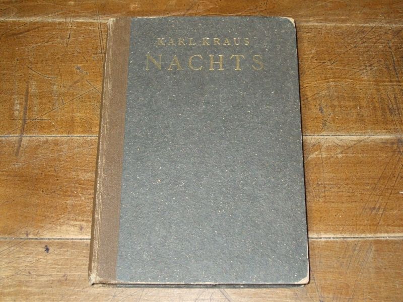 KRAUS, Karl: Nachts. Leipzig (Kurt Wolf), 1918. 204 S. OHLn. Goldprägung auf Rücken verblichen, Kapitale leicht bestossen, VSe leicht fleckig, Bleistiftanstreichungen am Textrand (vereinzelt). EA. WG 23.