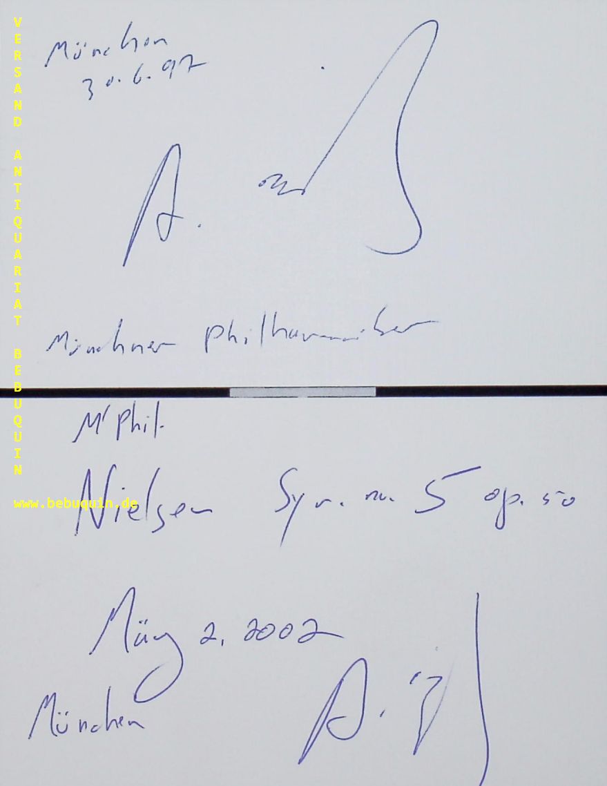 FISCH, Asher (Dirigent): 2 eigenhändig signierte und datierte Autogrammkarten. München (Philharmonie), 1997 + 2002. 8 x 12,5 cm. 2 Karteikarten. Asher Fisch, geboren in Jerusalem, begann seine Karriere als Assistent von Daniel Barenboim. Anschließend wurde er musikalischer Leiter an der Wiener Volksoper und an der New Israeli Opera in Tel Aviv. Von 2007 bis 2014 war er Principal Guest Conductor an der Seattle Opera, seit 2014 hat er die musikalische Leitung des West Australian Symphony Orchestra inne. Gastengagements führten ihn u. a. an die Opernhäuser von New York, London, Mailand, Neapel, Turin, Berlin, Dresden, Hamburg, Paris, Chicago und Los Angeles. Neben seinen Opernengagements trat er mit Orchestern wie dem Israel Philharmonic Orchestra, den Münchner Philharmonikern, dem Mozarteum Orchester Salzburg, dem NDR Elbphilharmonie Orchester Hamburg und dem Chicago Symphony Orchestra auf. (Staatsoper)