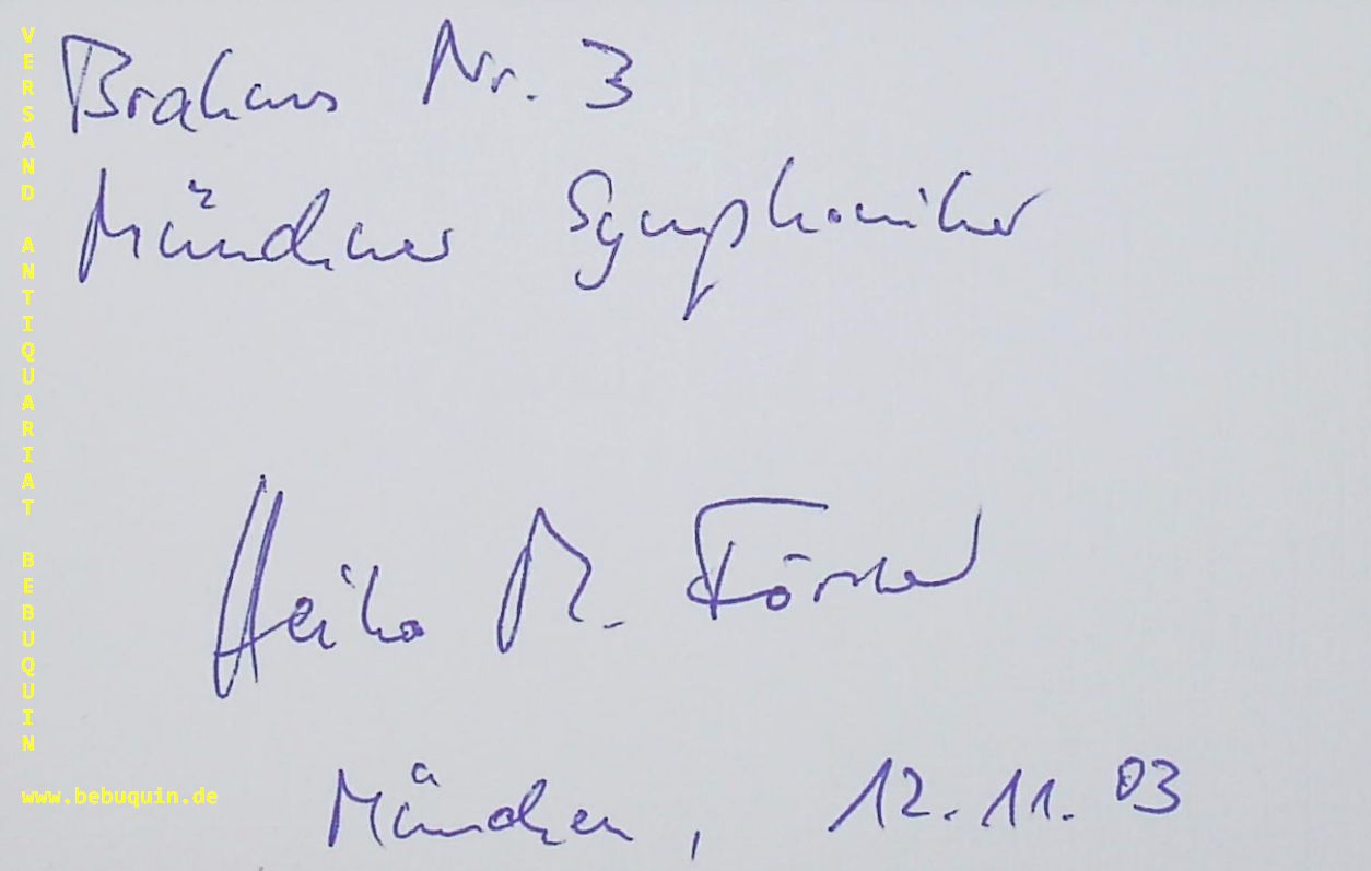 FÖRSTER, Heiko Matthias (Dirigent): eigenhändig signierte und datierte Autogramkarte. Münchner Symphoniker. München (Philharmonie), 12.11.2003. 8 x 12,5 cm. Karteikarte. Heiko Mathias Förster (* 1966 in Crivitz bei Schwerin) ist ein deutscher Dirigent. Seit 2014 ist er Chefdirigent des in Ostrava ansässigen Philharmonischen Orchesters Janácek. (Wikipedia)