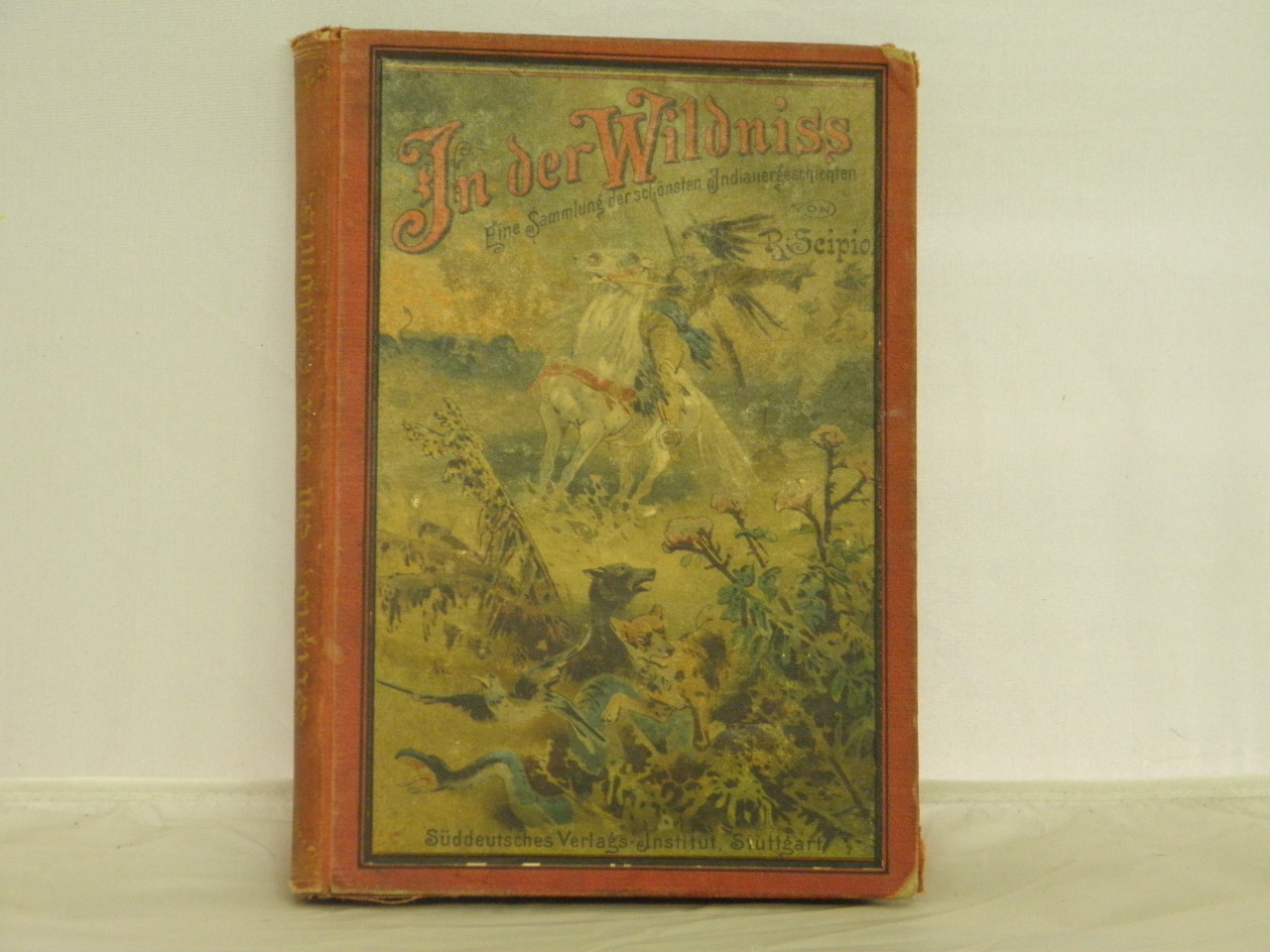 SCIPIO, Rudolf: In der Wildnis. Eine Sammlung der schönsten Indianergeschichten. Stuttgart (Süddeutsches), (1892). Gr. 8°. III, 260 S. mit zahlr. Textabb. + 8 Vollbildern in Holzschnitt und einem Farbendruck von G. Franz, R.E. Kepler, W. Zweigle u.a. OLn mit mont. Farbbild. Ecken leicht bestoßen, NaV. seltene EA Klotz 6705/85.
