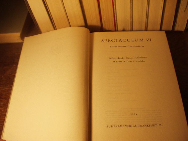 BECKETT, Samuel: Spiel. D.v. Elmar Tophoven. In: Spectaculum 6. Frankfurt (Suhrkamp), 1963. Gr. 8°. 14 S. OPb. dt. EA Knowlson 1051. Außerdem in diesem Band enthalten Texte von Brecht, Camus, Hildesheimer u.a.