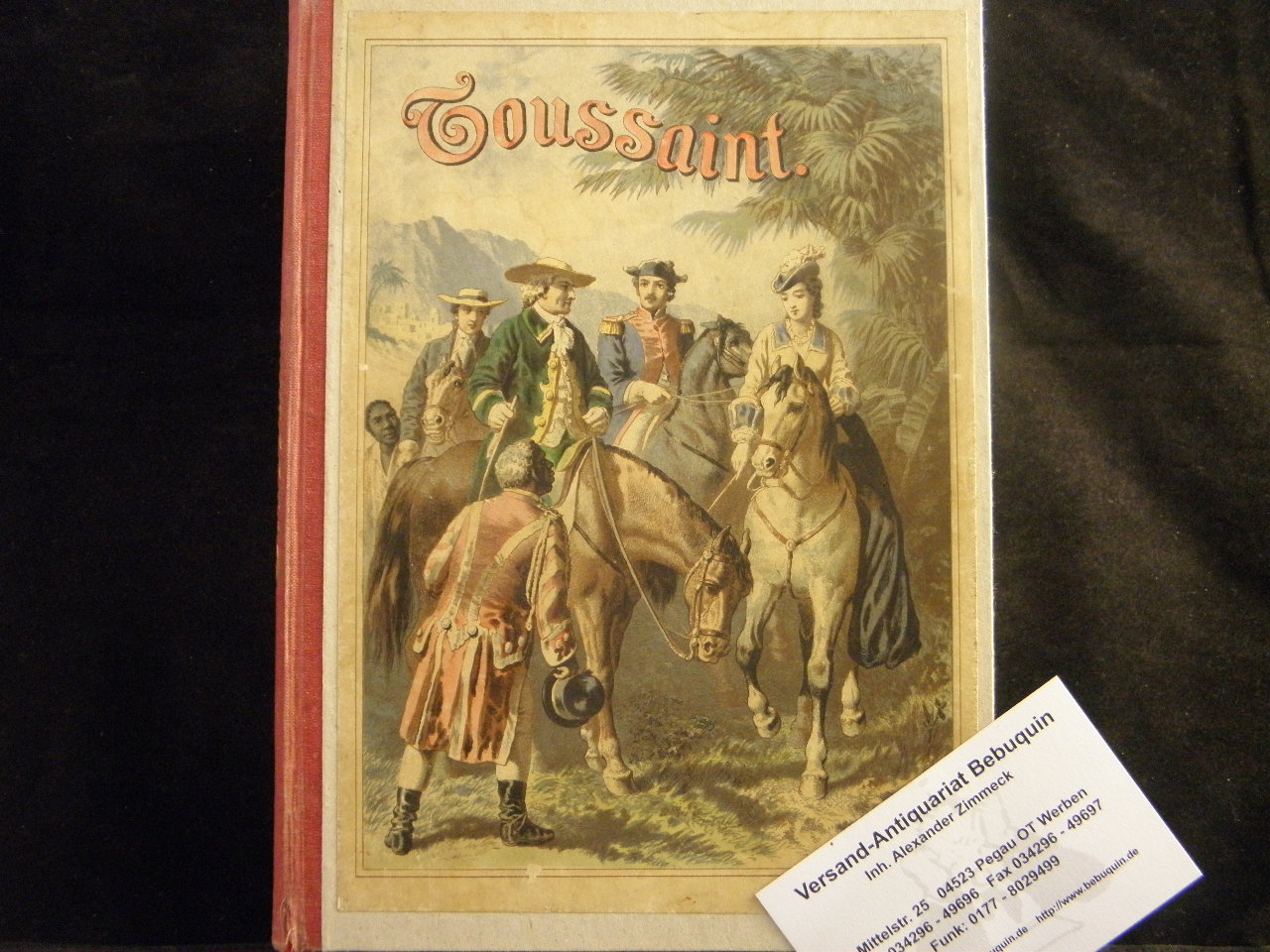 HOFFMANN, Otto: Toussaint, der Negerheld. Eine Erzählung für die reifere Jugend. Stuttgart (Hoffmann), (1874). Gr. 8°. 184 S. mit 6 Farbendruckbildern nach Aquarellen von Gust. Bartsch. OHLn mit mont. Deckelbild. kaum gebräunt, schönes Ex. EA über den haitianischen Freiheitskämpfer und Widersacher Napoleons. Wegehaupt 1617; Klotz 2791/27.