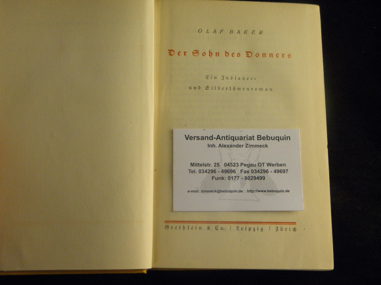 BAKER, Olaf: Der Sohn des Donners. Ein Indianer- und Silberlöwenroman. D.v. Marguerite Thesing. Leipzig (Grethlein), (1928) 307 (3) S. ill. OLn. NaV. dt. EA Klotz 227/1.