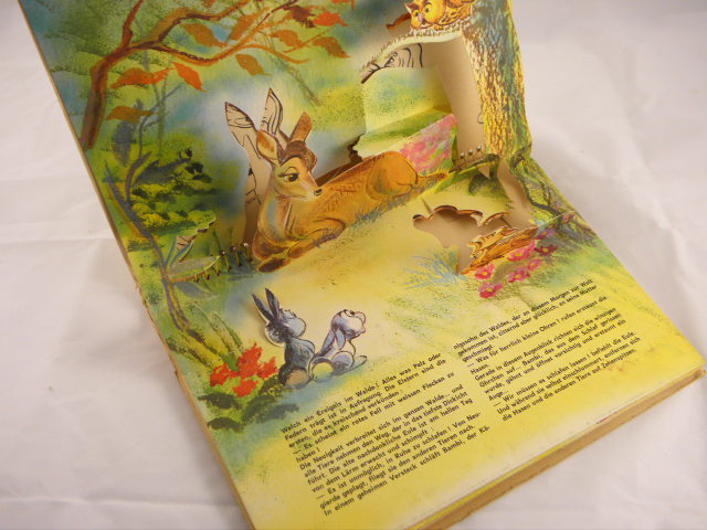 AUFSTELLBILDERBÜCHER.– DISNEY, Walt: Bambi. Bonn (Orania), ca 1965. Quer 4°. 8 aufstellbare Szenen mit farbigen teils bewegbaren Panoramen. farb. ill. OPb mit Kordelbindung. Schiebevorrichtung im Rückdeckel lädiert, sonst ganz gut erhalten. = Unsere Panorama Bücher Nr. 701. Recht seltene dt. EA.