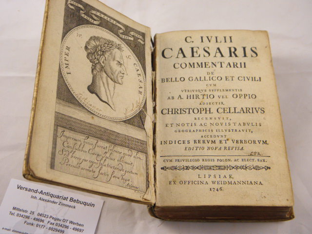 ANTIKE.– CAESAR, Gajus Julius: Commentarii de bello gallico et civili cum utriusque supplementis ab A. Hirtio vel Oppio adiectis Christophorus Cellarius recensuit, & Notis ac novis Tabulis Geographicis illustrauit, Accedunt indices rerum et verborum. Editio Nova revisa Leipzig (Weidmann), 1746. kl. 8°. 1 gest. Frontispiz, 7 Bl., 743 S., 72 nn. S. Index, 6 gefaltete Kupferstiche (Landkarten). Ldr der Zeit. Einband angeschmutzt, Marginalien von ca 1800 auf Vorsatz, vorderes Gelenk etwas gelockert, insgesamt sehr gutes Ex.