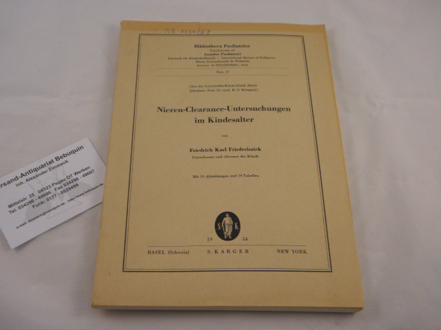 MEDIZIN.– FRIEDERISZICK, Friedrich Karl: Nieren-Clearance-Untersuchungen im Kindesalter. Basel (Karger), 1954. Gr. 8°. 112 S. mit 13 Abb. und 19 Tabellen. OBr. = Bibliotheca Paediatrica, Fasc. 57. EA.
