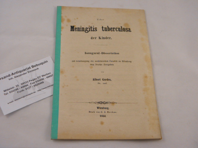 MEDIZIN.– GERDES, Albert: Ueber Meningitis tuberculosa der Kinder. Inaugural-Dissertation. Würzburg (Becker), 1854. 31 S. Interimsrücken. etwas gebräunt. EA dieser wichtigen Hochschulschrift.