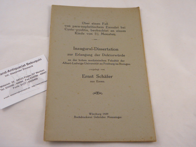 MEDIZIN.– SCHÄFER, Ernst: Über einen Fall von para-nephritischem Exsudat bei Cysto-pyelitis, beobachtet an einem Kinde von 5 1/2 Monaten. Inaugural-Dissertation. Würzburg (Memminger), 1929. 23 S. OKart. EA.