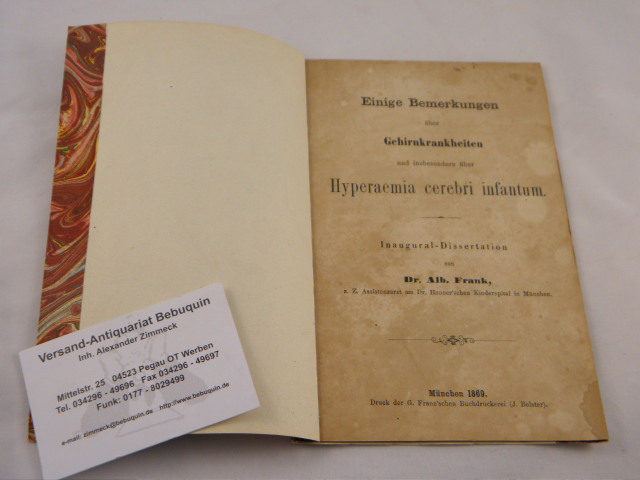MEDIZIN.– FRANK, Albert: Einige Bemerkungen über Gehirnkrankheiten und insbesondere über Hyperaemia cerebri infantum. Inaugural-Dissertation. München (Bolster), 1869. 15 S. O.Interims.Br. Papier etwas gebräunt. seltene EA.