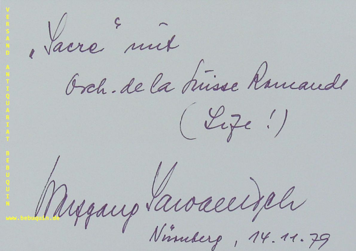 SAWALLISCH, Wolfgang (Dirigent): eigenhändig signierte und datierte Autogrammkarte mit eigenhändigem Titel des Stückes: „Sacre (Life!)“ Nürnberg, 14.11.1979. 10,5 x 14,5 cm. große Karteikarte. Wolfgang Sawallisch (* 26. August 1923 in München; † 22. Februar 2013 in Grassau) war ein deutscher Dirigent und Pianist. (Wikipedia)