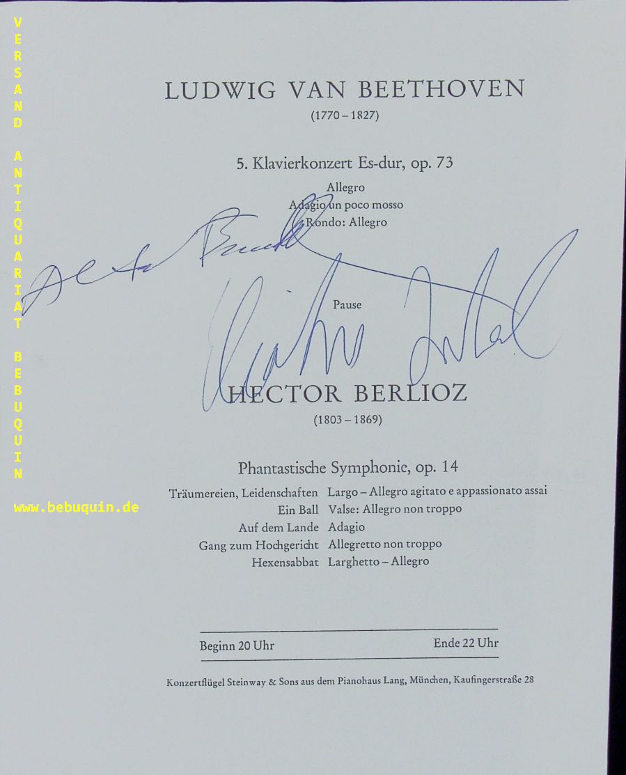 INBAL, ELIAHU (Dirigent) + BRENDEL, Alfred (Violinist): eigenhändig von beiden signierte und datierte Programmheftseite. München, 14.1.1974. 23,5 x 18,5 cm. 1 Bl. Eliahu Inbal (* 16. Februar 1936 in Jerusalem) ist ein israelischer Dirigent. Alfred Brendel, KBE (* 5. Januar 1931 in Wiesenberg, Tschechoslowakei) ist ein österreichischer Pianist. Er gilt als einer der bedeutendsten Interpreten klassisch-romantischer Musik des 20. Jahrhunderts. (Wikipedia)