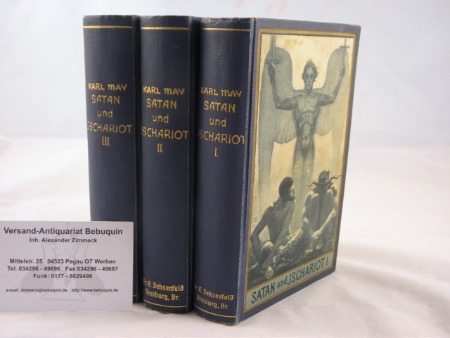 MAY, Karl: Satan und Ischariot. Reiseerlebnisse. 31.-35.; 26.– 30.; 26.– 30. Tsd. 3 Bände. Freiburg (Fehsenfeld), 1905 / 1906. 550 (1), 540, 615 (1) S. ill. blaue OLn von Sascha Schneider. (DB 73). Schnitt etwas gebräunt, minimal schief, nur sehr vereinzelt braunfleckig, insgesamt schönes Ex. = Gesammelte Reiseerzählungen, Bd. XX – XXII. Plaul 287.6 + 291.5 + 292.5.
