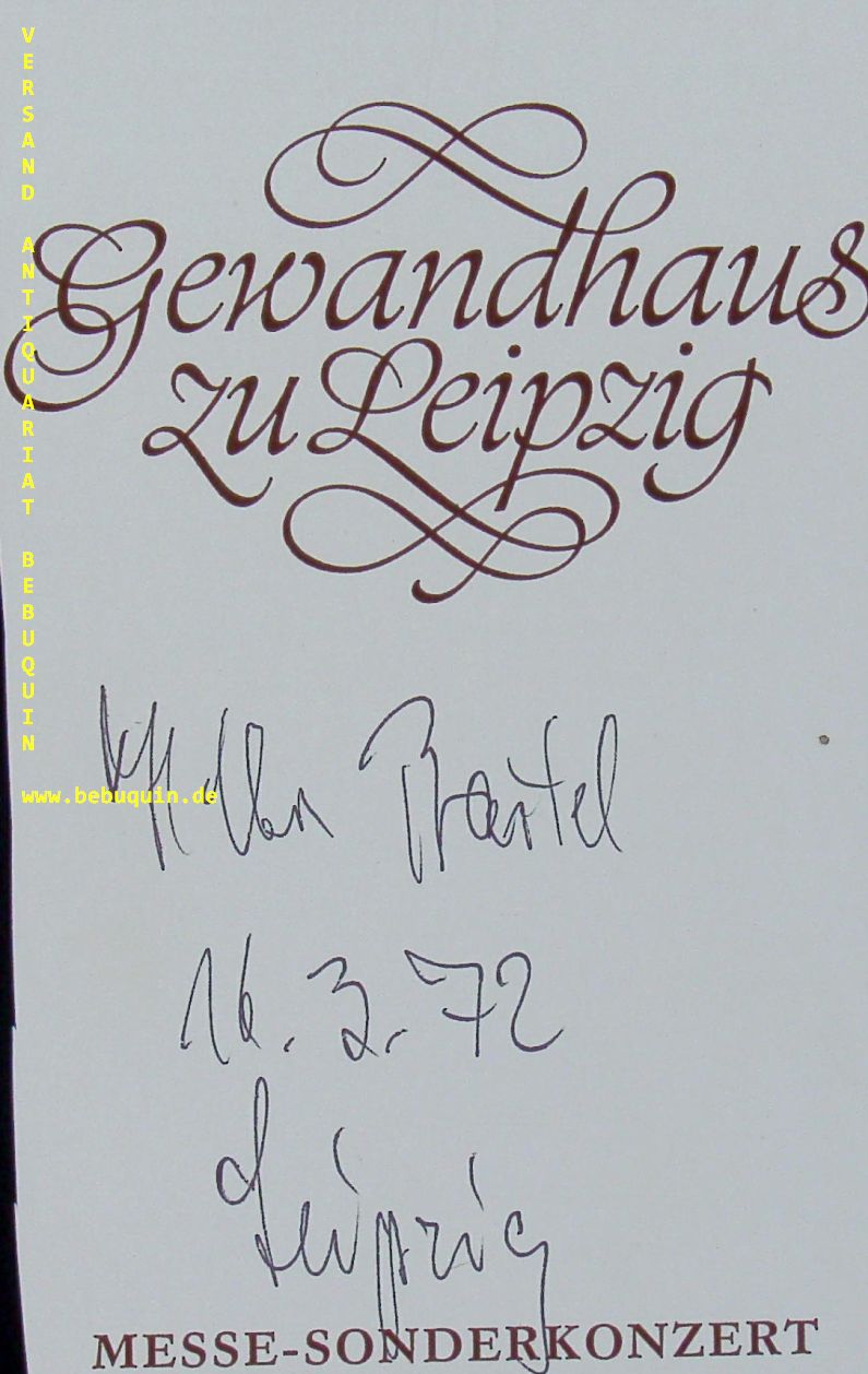 BARTEL, Hans-Christian (Bratschist): eigenhändig signiertes und datieres Programmblatt. Leipzig (Kongresshalle), 16.3.1972. 23 x 21 cm. 1 Bl. Hans-Christian Bartel (* 27. November 1932 in Altenburg; † 27. Dezember 2014 in Leipzig) war ein deutscher Bratschist und Komponist. (Wikipedia)