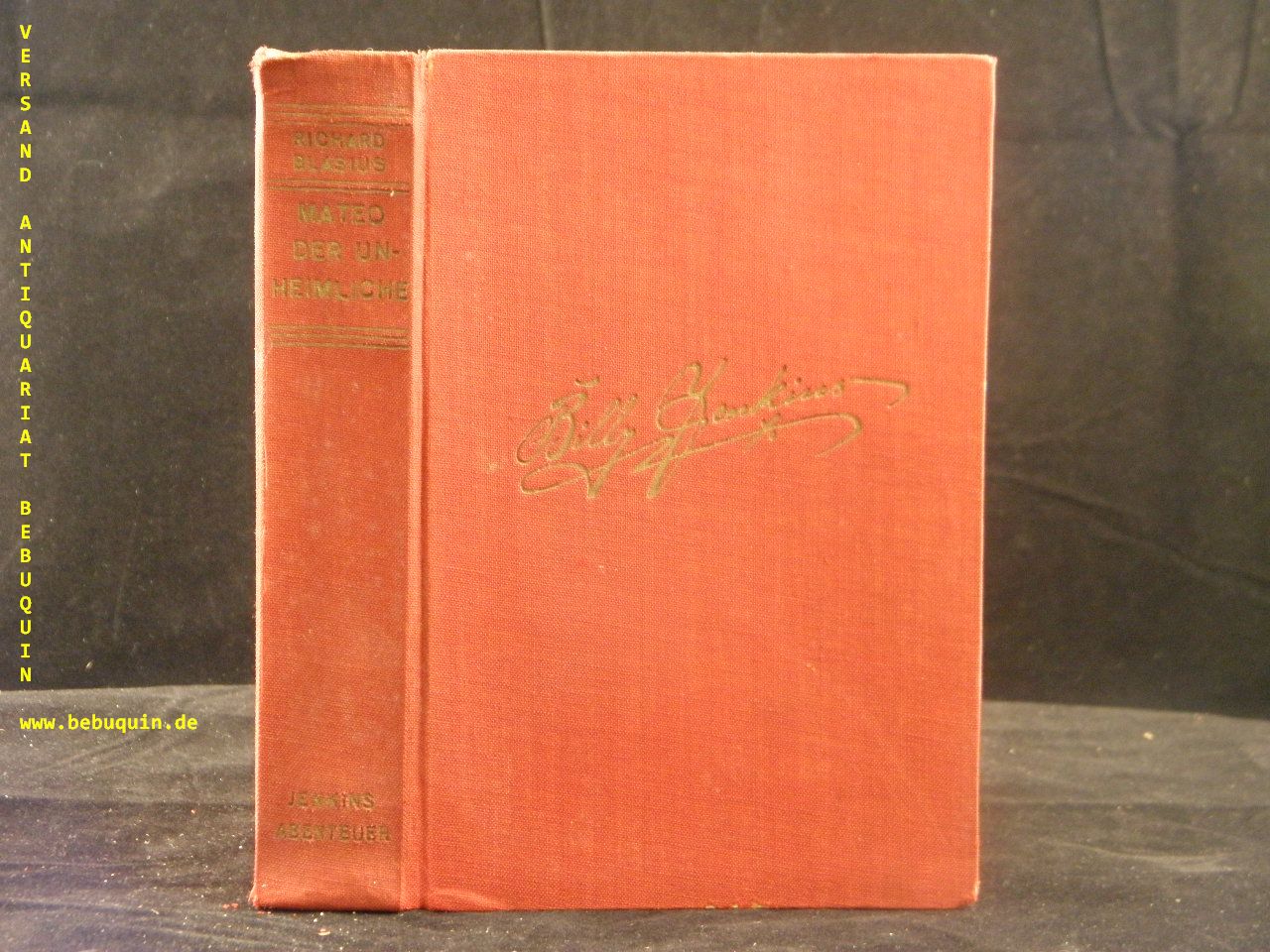 BILLY JENKINS.– 051 / BLASIUS, Richard: Mateo der Unheimliche. Ein Abenteuer des Westmannes Billy Jenkins. Leipzig (Dietsch), 1939. 284 (3) S. rotes OLn mit goldgeprägter Signatur. oberes Kap bestoßen, Gelenke gelockert, NaV, noch ordentliches Ex. = Bücher der Spannung, Nr. 51. EA.