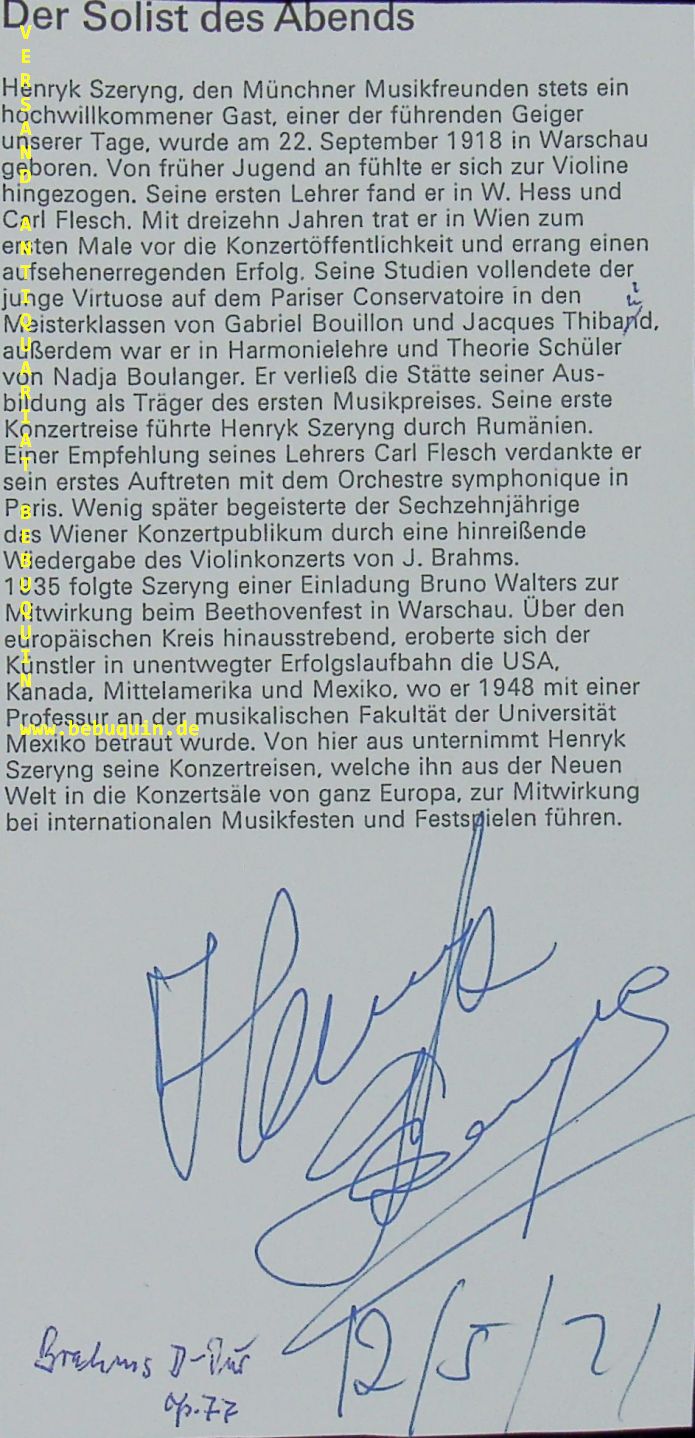 SZERYNG, Henryk (Violinist): eigenhändig signiertes und datiertes Blatt. München (Herkulessaal); 12.5.1971. 18,5 x 9 cm. 1 Bl. Henryk Szeryng (* 22. September 1918 in Warschau; † 3. März 1988 in Kassel) war ein polnisch-mexikanischer Geiger, Violinpädagoge, Herausgeber, Komponist und Diplomat, der seit 1946 in Mexiko lebte und seit dem 21. Oktober 1948 die mexikanische Staatsbürgerschaft hatte. (Wikipedia)