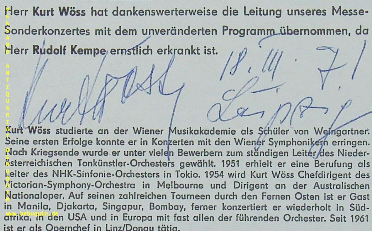 WÖSS, Kurt (Dirigent): eigenhändig signierter und datierter Ausschnitt aus Programmheft. Leipzig, 18.3.1971. 7 x 12 cm. 2 Bl. Kurt Wöss (* 2. Mai 1914 in Linz; † 4. Dezember 1987 in Dresden) war ein österreichischer Dirigent. (Wikipedia)