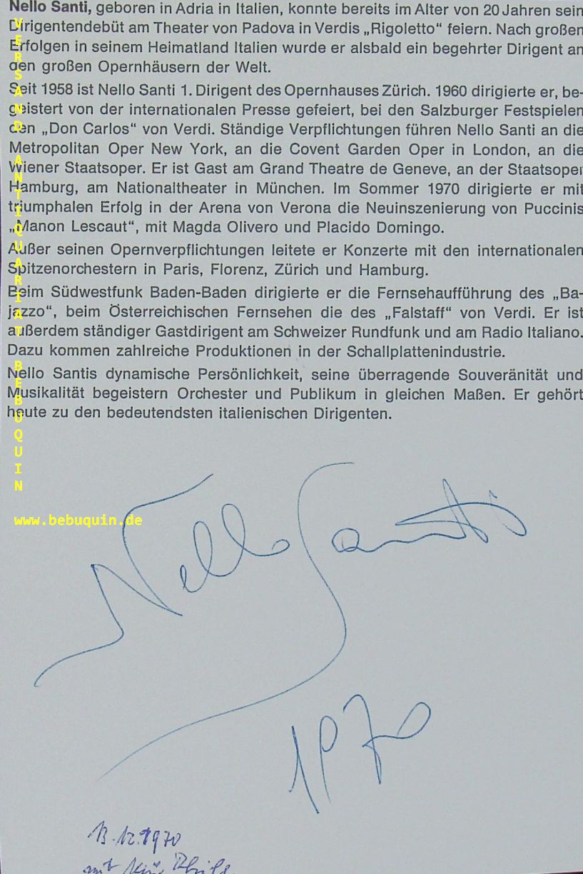 SANTI, Nello (Dirigent): eigenhändig signierter und datierter Zeitschriftenausschnitt. München, 13.12.1970. 18,5 x 12,5 cm. 1 Bl. Nello Santi verfügte über ein fotografisches Gedächtnis, kannte die Noten sowie die Texte aller Instrumental- bzw. Gesangspartien der meisten Werke auswendig und dirigierte grundsätzlich ohne Partitur, auch in den Proben. So konnte er in den Proben, wenn mal ein Sänger ausfiel, auch dessen Partie singen. Mit modernen Inszenierungen konnte er nichts anfangen, und neuere Werke interessierten ihn wenig; seine Liebe galt den italienischen Belcanto-Komponisten Verdi, Donizetti und Bellini. Alban Bergs Wozzeck aus dem Jahr 1925 ließ er gerade noch gelten. (Wikipedia)