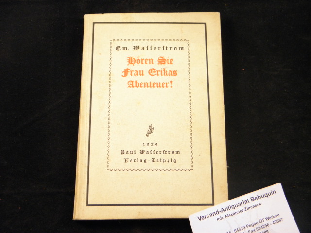 WASSERSTROM, Emil: Hören Sie Frau Erikas Abenteuer! Leipzig (Wasserstrom), 1929. 132 S. OKart. leicht bestaubt. EA mit der eigenhändigen datierten und voll signierten Verfasserwidmung auf Vorsatz. Weltweit ist weder dieser Titel noch der Verfasser nachweisbar.