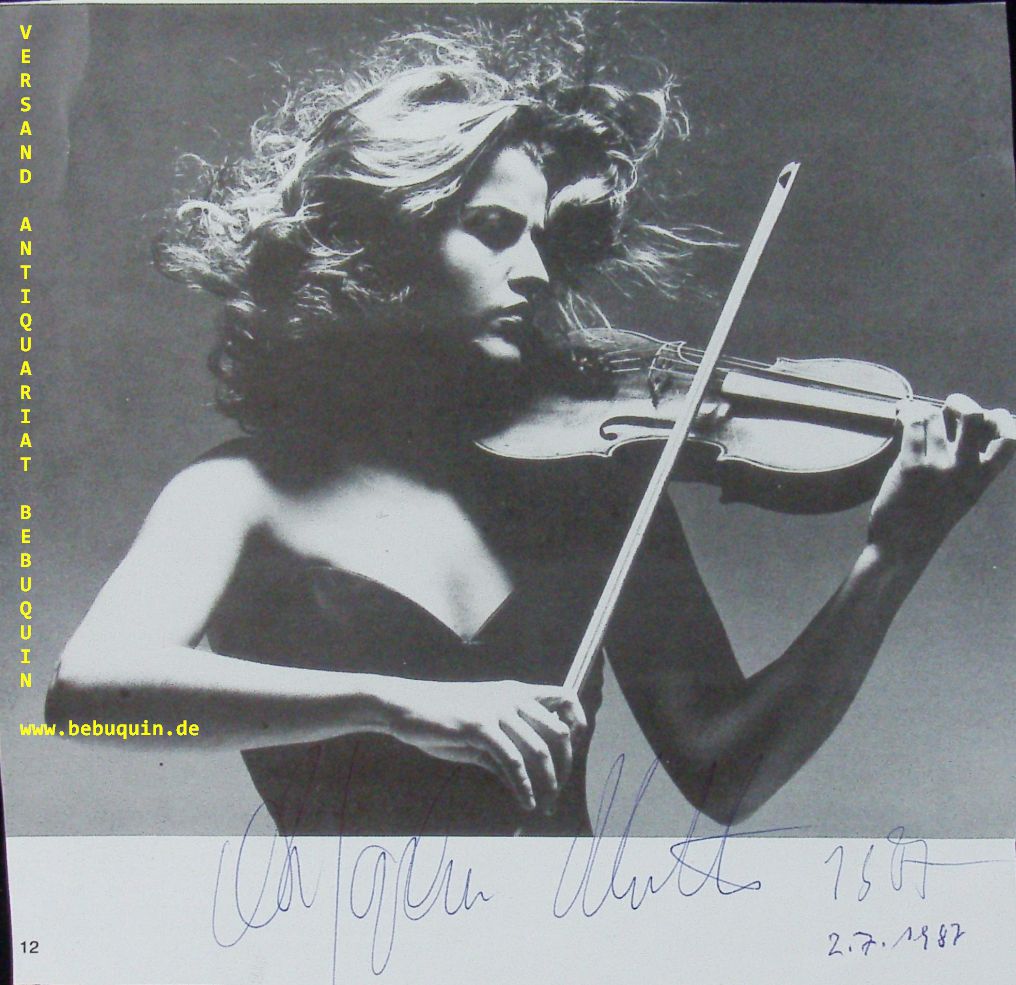 MUTTER, Anne Sophie (Violinistin): eigenhändig signiertes und datiertes Portrait. München (Philharmonie), 2.7.1987. 19 x 19 cm. Programmheftausschnitt. Anne-Sophie Mutter (* 29. Juni 1963 in Rheinfelden (Baden)) ist eine deutsche Geigerin. Der Chef des Labels Deutsche Grammophon sagt, dass Anne-Sophie Mutter eine „Identifikationsfigur“ für das Label sei, sie habe „quasi die Fackel von ihrem Mentor Herbert von Karajan übernommen“ (Wikipedia)