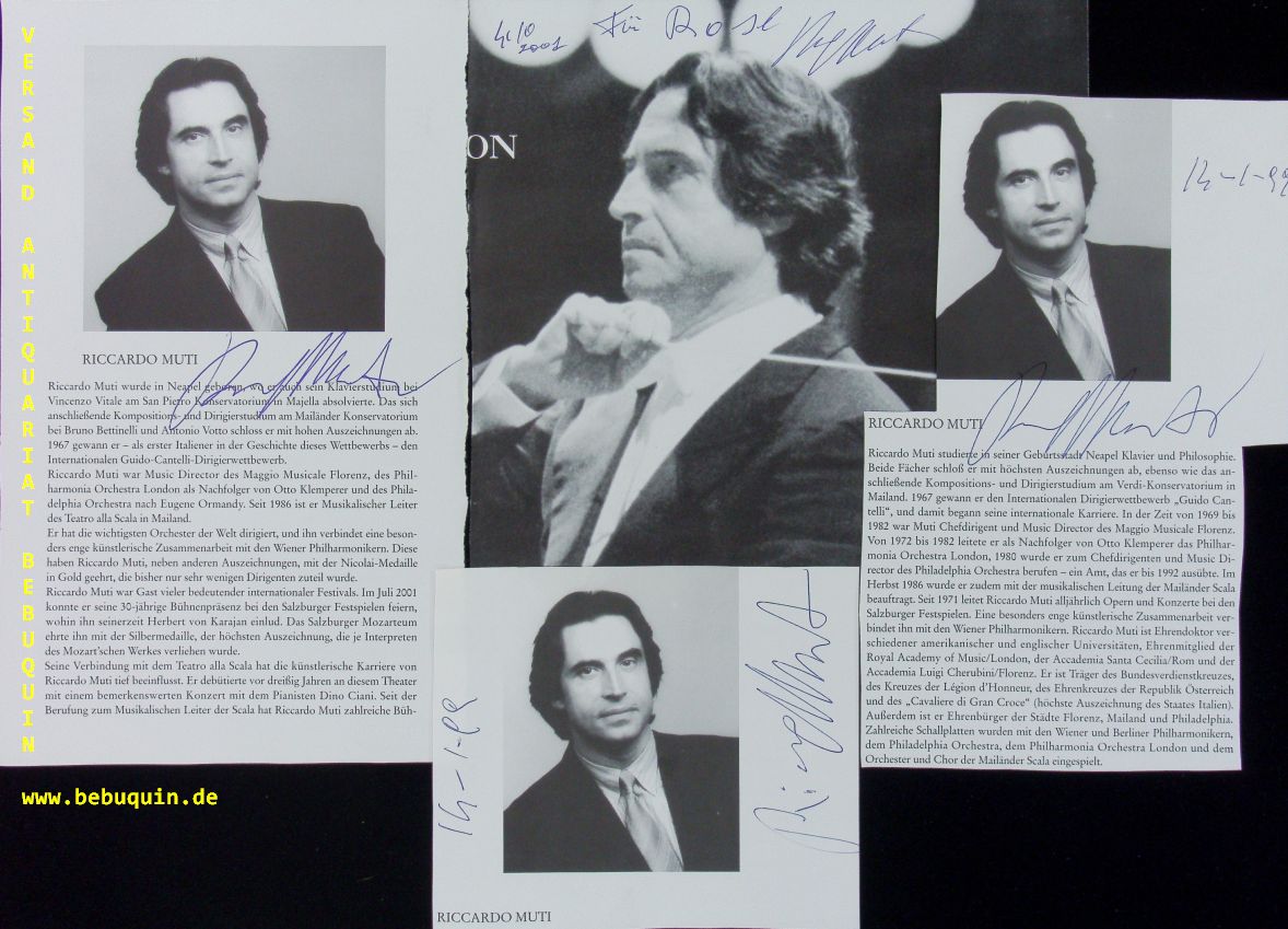MUTI, Riccardo (Dirigent): 4 eigenhändig signierte und datierte Portraitbilder. München (Philharmonie), 14.1.1999. ca. 10 x 15 cm. 4 Programmheftausschnitte in Programmheft. 16 S. mit zahlr. Abb. OKart. = Winderstein Konzerte. Riccardo Muti (* 28. Juli 1941 in Neapel) ist ein italienischer Dirigent. Jewgeni Igorewitsch Kissin (* 10. Oktober 1971 in Moskau, Sowjetunion) ist ein russischer Pianist und Komponist. Seit 2002 besitzt Kissin neben der russischen auch die britische und seit 2013 auch die israelische Staatsangehörigkeit. (Wikipedia)