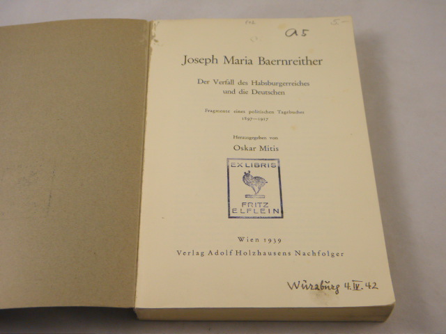 BAERNREITHER, Joseph Maria: Der Verfall des Habsburgerreiches und dei Deutschen. Fragmente eines politischen Tagebuches 1897 – 1917. Hrsg. von Oskar Mitis. Wien (Holzhausen), 1939. Gr. 8°. XXVI, 313 S. + 1 Falttafeln. schichte Br. der Zeit. gutes Ex. seltene EA.