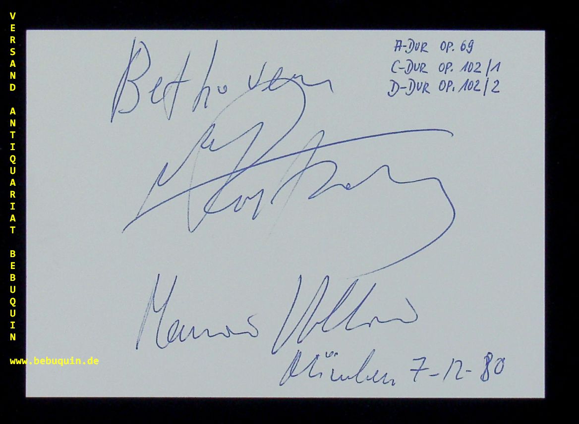 ROSTROPOWITSCH, Mstislaw (Cellist) + POLLINI, Maurizio (Dirigent): eigenhändig signierte und datierte Autogrammkarte. München, 7.12.1980. 10,5 x 14,5 cm. große Karteikarte. Mstislaw Leopoldowitsch Rostropowitsch (* 27. März 1927 in Baku; † 27. April 2007 in Moskau) war ein russischer Cellist, Dirigent, Pianist, Komponist und Humanist. Er gilt als einer der bedeutendsten Cellisten der Geschichte. Maurizio Pollini (* 5. Januar 1942 in Mailand) ist ein italienischer Pianist und Dirigent. (Wikipedia)