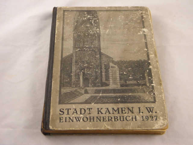 KAMEN.– WEBER: (Bearb.) Einwohnerbuch der Stadt Kamen i.W. 1927. und der Gemeinden Afferde, Altenvögge, Bergkamen, Boenen, Derne, Heeren-Werbe, Heil, Husen, Lerche, Methler, Niederaden, Nordbögge, Oberaden-Oberberge, Pelkum, Rottum, Rünthe, Sandbochum, Südkamen, Wasserkurl, Weddinghofen, Westick. Essen (Lichterfeld & Fritz), 1927. Gr. 8°. XXXIV, 239 S. + zahlr. Werbetafeln. ill. OHLn. Einband stärker beschabt, Gelenke etwas gelockert, Papier anfangs fingerfleckig und gebräunt, insgesamt ordentlich. sehr seltenes Adressbuch.