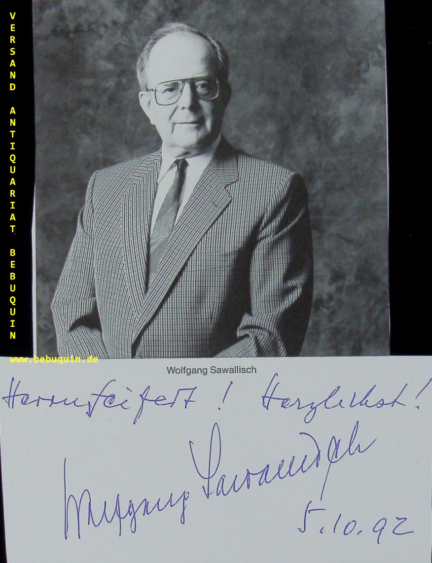 SAWALLISCH, Wolfgang (Dirigent): eigenhändig signiertes und datiertes Portraitbild: „Herrn Seifert! Herzlich!“ München, 5.10.1992. 19 x 14 cm. 1 Blatt. Wolfgang Sawallisch (* 26. August 1923 in München; † 22. Februar 2013 in Grassau) war ein deutscher Dirigent und Pianist. (Wikipedia)