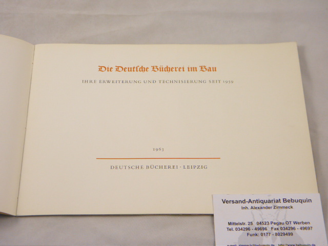 LEIPZIG.– KRIEGER, Waldemar + FUNKE, Fritz + ROST, Gottfried: (Bearb.) Die Deutsche Bücherei im Bau. Bilder unde Skizzen. Ihre Erweiterung und Technisierung seit 1959. Leipzig (Deutsche Bücherei), 1963. Quer Gr. 8°. 12 Bl. mit fotografischen Bildtafeln. OBr. mit OUmschl. gut erhalten. seltene EA.