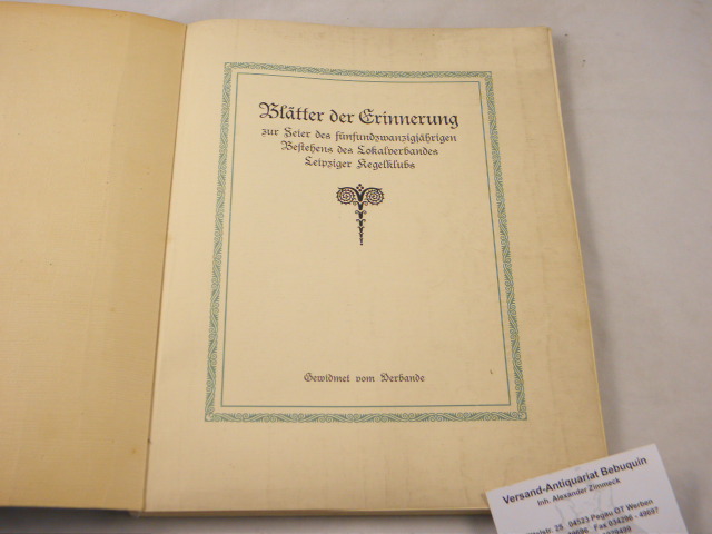 LEIPZIG.– BLÄTTER DER ERINNERUNG.– Zur Feier des 25jährigen Bestehens des Lokalverbandes Leipziger Kegelkubs. Leipzig (Schröter), 1910. 4°. 144 S. + 4 Portraittafeln. ill. OKart. Marginalien auf Deckel, etwas angeschmutzt, einige Anstreichungen im Text.