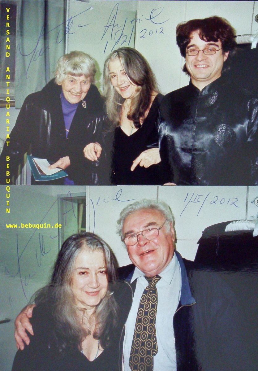 ARGERICH, Martha (Pianistin): 2 eigenhändig signierte und datierte eindrucksvolle Privatfotos. München (Philharmonie), 1.2.2012. 12,5 x 17,5 cm. 2 Farbfotos mit Willi und Rosel Seifert. Martha Argerich (* 5. Juni 1941 in Buenos Aires) ist eine argentinisch-schweizerische Pianistin. Im Jahr 2005 erhielt sie die Auszeichnung Praemium Imperiale, den „Nobelpreis der Künste“. Im Jahr 2014 wurde sie mit dem ECHO Klassik in der Kategorie „Konzerteinspielung des Jahres (Klavier)“ mit dem Orchestra Mozart Bologna unter Claudio Abbado für Mozarts Klavierkonzerte 20 & 25 ausgezeichnet. 2016 erhielt sie den Kennedy-Preis. (Wikipedia)