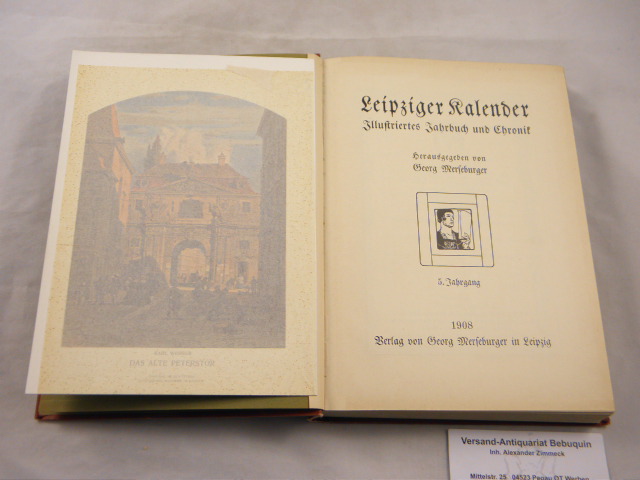 LEIPZIG.– MERSEBURGER, Georg: (Hrsg.) Leipziger Kalender. 05. Jg. Illustriertes Jahrbuch und Chronik. Leipzig (Merseburger), 1908. 292, 104 S. mit zahlr. teils farb. Abb. + teils gefalteten Bildtafeln. ill. OLn. gut erhalten. EA.