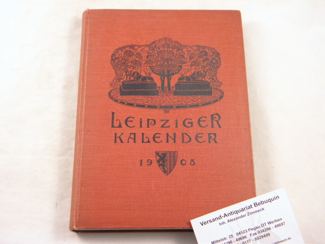 LEIPZIG.– MERSEBURGER, Georg: (Hrsg.) Leipziger Kalender. Ein illustriertes Jahrbuch. Leipzig (Schalscha-Ehrenfeld), 1905. 256, 4, 56 S. mit zahlr. teils farb. Abb. + teils gefalteten Bildtafeln. ill. OLn. gut erhalten. EA dieses frühen Jahrbuchs.